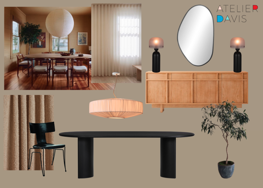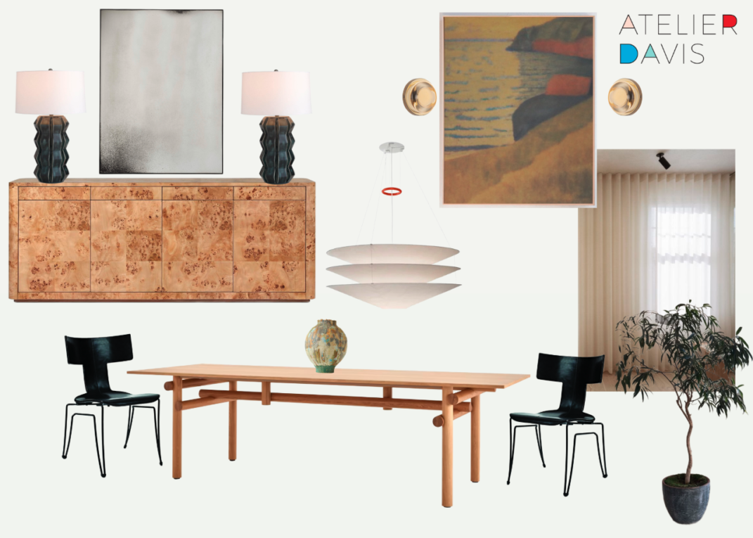 Team Atelier Davis is working on a new project in Dallas, and we’ve officially moved from concept boards to fully developed schemes. After sharing the living room and entry schemes last week, we’re refining the dining room with real product selections that reflect our clients’ wish for warmth, contrast, and clean-lined simplicity.