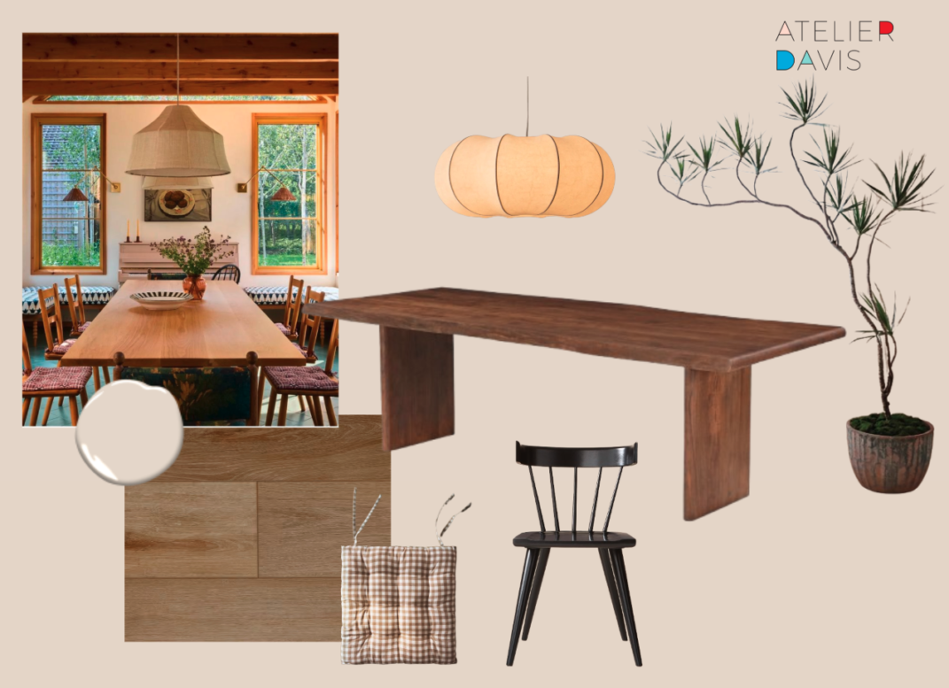 Clockwise from Top Left: Benjamin Moore Sonnet, Etsy Wabi-Sabi Silk Pendant Light, West Elm Margaret Live Edge Dining Table, CB2 Essential Black Wood Dining Chair by Paul McCobb, Zara Home Dyed Thread Chair Cushion