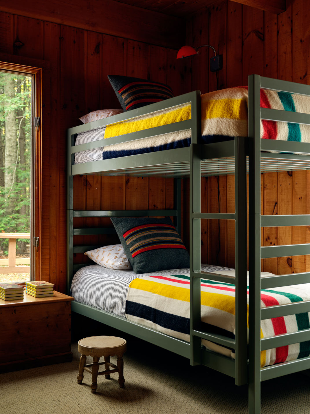 We had a lot of fun designing the bunk room, which was all about playfulness and durability. From bold bedding to bunk-friendly lighting, the moodboard laid out a layered mix of patterns and textures. The completed space is ready for kids, cousins, and weekend guests alike.