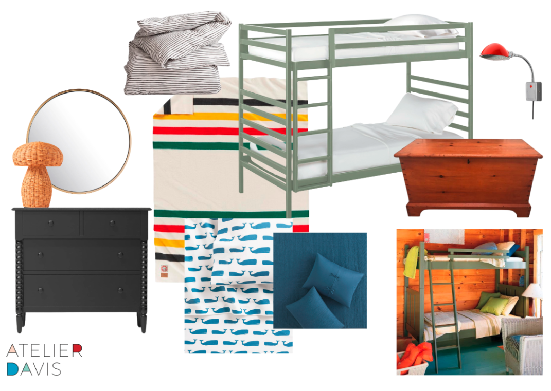 Clockwise from Top Left: Schoolhouse Radar Plug-In Sconce in Persimmon, Room&Board Fort Bunk Beds in Sage, Schoolhouse Painterly Stripe Duvet Cover, Pottery Barn Round Gold Mirror, Wonderland Natural Wicker Rattan Table Lamp by Leanne Ford and Jenny Lind Black Wood 4-Drawer Kids Dresser available from Crate&Barrel, Pendleton Glacier National Park Blanket, Garnet Hill Mini-Print Percale Sheet Set in Lapis Whales and Dream Quilt in Indigo
