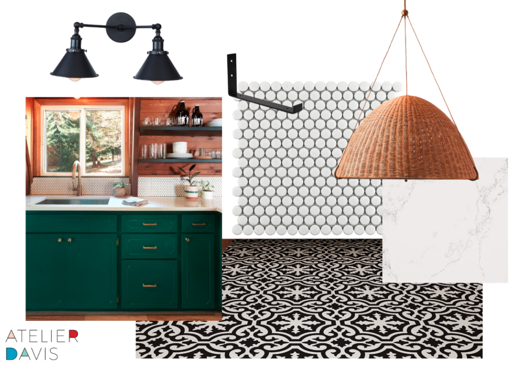 Clockwise from Top Left: Double Light Wall Sconce from Etsy, Crate & Barrel Harwich Large Woven Rattan Dome Pendant Light by Jake Arnold, WallPops Parma Peel and Stick Floor Tiles