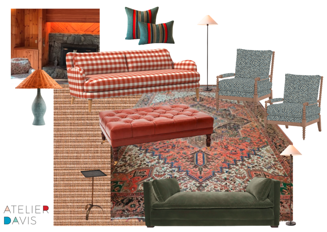 The living room moodboard leaned into a mix of spool chairs, velvet seating, and layered textiles—classic cottage with a modern twist. The finished space carries that spirit, balancing comfort and polish while keeping the lake views front and center.