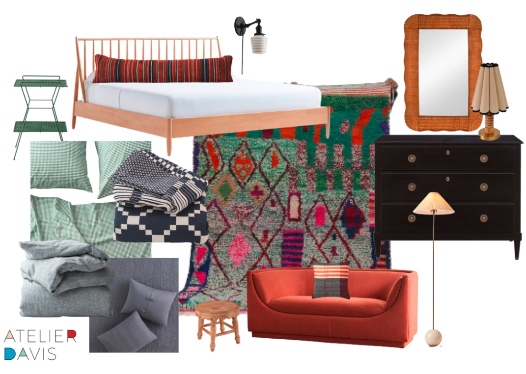 Clockwise from Top Left: Schoolhouse Telephone Table in Laurel, Crate & Barrel Carson Natural Wood Spindle King Bed, The Citizenry Paso Lumbar Pillow, Lulu and Georgia Yarely Mirror, Khaki Table Lamp available from Etsy, One Kings Lane Adams 3-Drawer Dresser, West Elm Wood Sphere Floor Lamp by Sarah Sherman Samuel, Urban Outfitters Aria Upholstered Curved Sofa in Rust, Ballard Designs Scalloped Stand, Schoolhouse Linen Duvet Cover, Schoolhouse Winter + Summer Cotton Coverlet, Schoolhouse Gingham Percale Sheet Set in Juniper