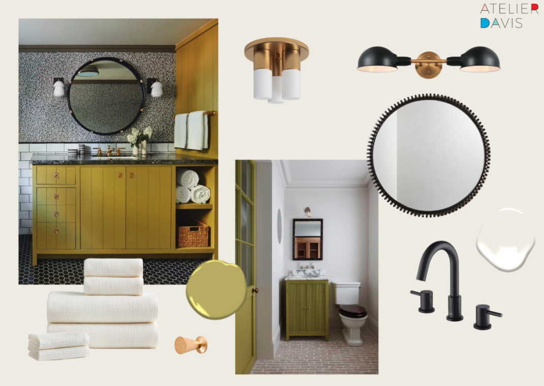 The guest bath is clean, grounded, and quietly confident. Light walls keep the space feeling open and fresh, while the chartreuse vanity tone adds contrast and a sense of permanence. Dark accents bring definition, and soft, tactile finishes warm things up so it never feels too stark. It’s a straightforward, welcoming space, designed to feel polished but relaxed.