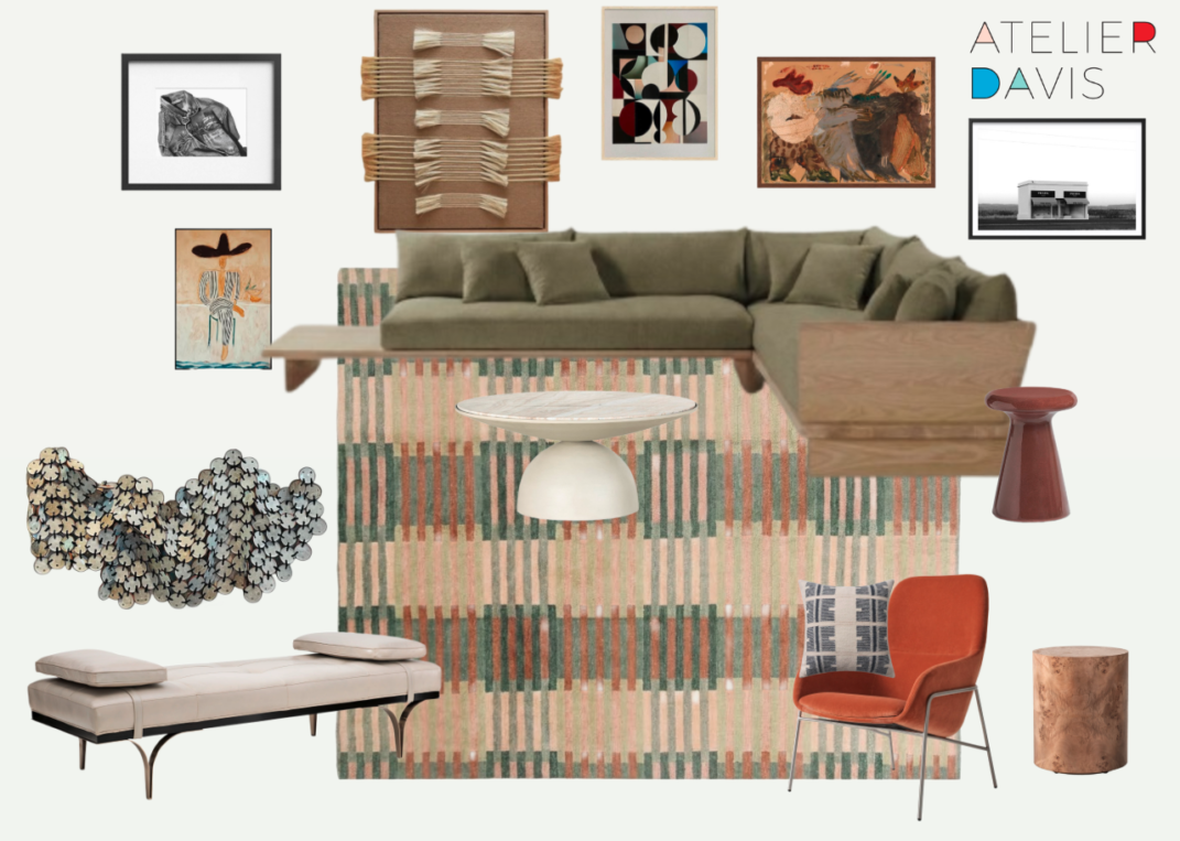 Sunshine and Flowers, Rivers and Rushing Winds IV available from Tappan, The Muir Sectional from Maiden Home, Four Hands Kika End Table in Smooth Red Concrete, Four Hands Caya End Table in Caramel Burl, Blu Dot Acre Lounge Chair, The Citizenry Agata Pillow, Four Hands Corbett Coffee Table in Creamy Taupe Marble, Caracole Head To Head Daybed, Etsy Cowboy Abstract Oil Painting