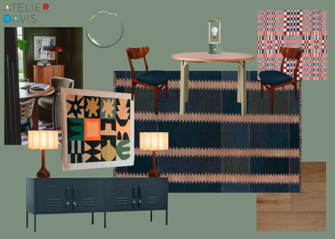 In the game room, we shifted the palette back into cooler territory with rich green walls and accents that run from sage to slate. Rounded silhouettes in the table and lighting add softness, while a classic fabric pattern and a handwoven rug bring in texture and depth. Clean-lined storage and a graphic art moment give the room a crisp edge. The result is a relaxed hangout with just enough color and character to keep the energy up during long game nights.
