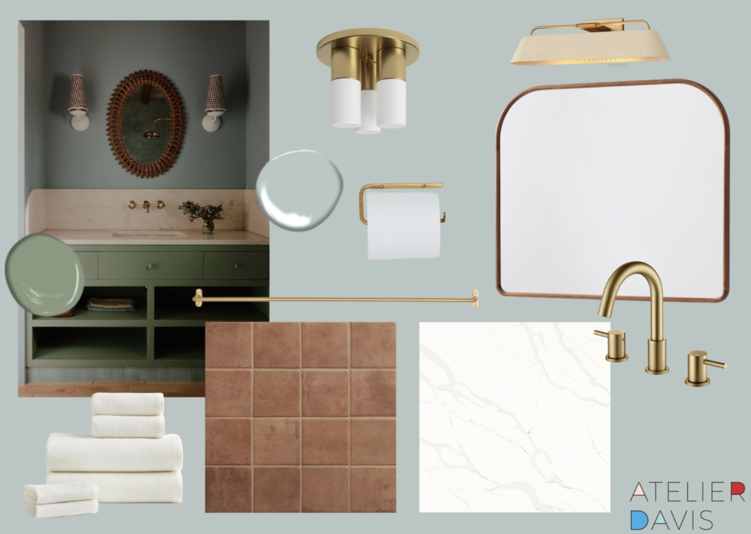The primary bathroom pairs cool gray walls with a saturated green vanity that adds richness and contrast. Terracotta tile introduces contrast and a subtle sense of warmth, while brass details bring a subtle glow.
