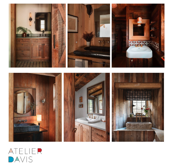 Bathroom concepts bring together tactile finishes—stone, wood, textured tile—with a clean, modern sensibility. These combinations carry the home’s theme of honoring tradition while embracing fresh design ideas.