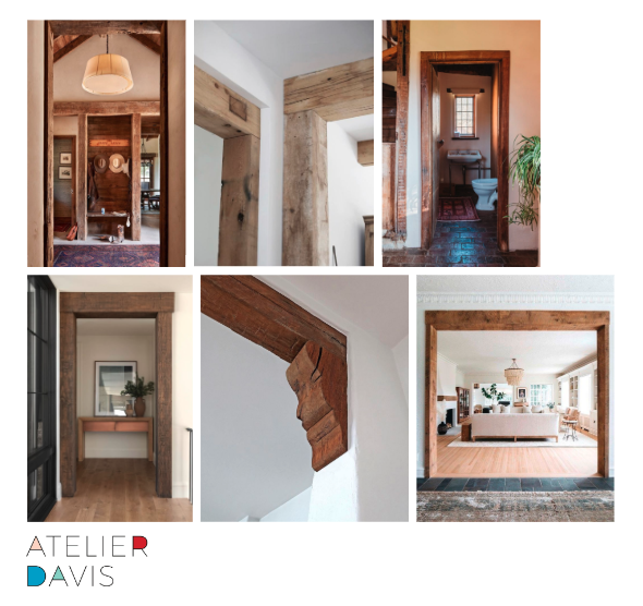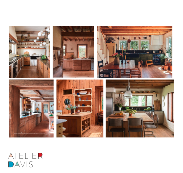 For the first phase, we pulled together a series of concept boards that begin to shape the story of the home. The guiding idea is to celebrate the original structure’s beams and materials while layering in lighter, more contemporary moments where the new additions take over. The result is a palette that mixes woodsy textures, clean lines, and a sense of lived-in comfort.