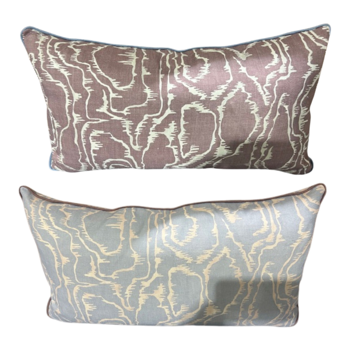Details: Pillow #1 with Tilda fabric in Huckleberry by Leah O'Connell and Samuel & Sons Flanders Cord in Water / Pillow #2 with Tilda fabric in Waterloo by Leah O'Connell and Samuel & Sons Flanders Cord in Heather